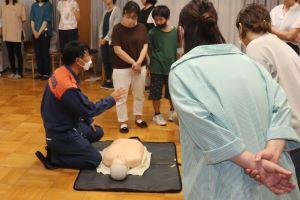 心臓の役割や脳の大切さについての話を聞いた後、実際に胸骨圧迫の練習を順番にしました。1分間に100~120回の速いテンポで胸が5㎝沈むまで圧迫する。