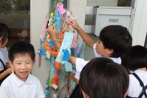 今日は、7日。1年生が七夕飾りを作り、短冊にお願い事をかいて笹に飾りました。だんだん曇ってきて残念ですが、みんなのお願い事がかなうといいですね。先生方のお願いごとは、きっとみんながかなえてくれると思います。