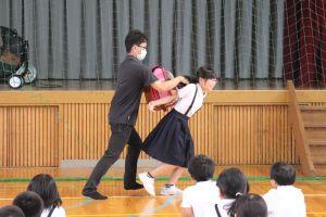 その後、下校時に不審者にあった場合のロールプレーイングを代表の児童に行ってもらいました。