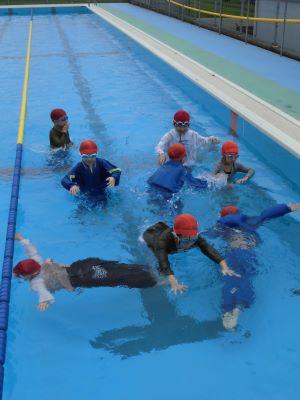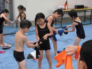 まずは、服を着て泳いでみます。泳ぎにくいですね。