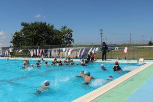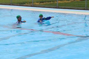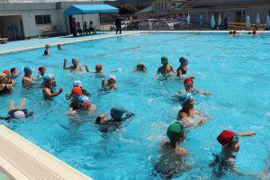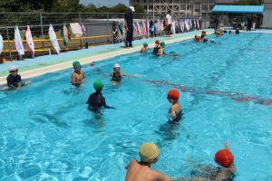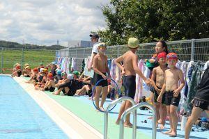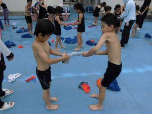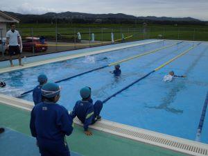 低学年と高学年がペアになり、歩いたり、泳いだりしてのリレーです。