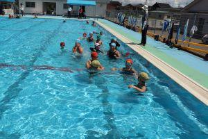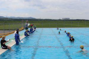 プールでの泳ぎの練習の他、安全指導として毎年、着衣泳の指導を行っています。