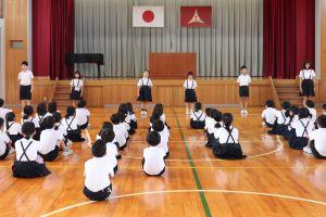 最初は、各学年のふり返り発表です。自分のがんばったことや楽しかったこと、2学期の目標を全校の前で話します。とても長い文章でしたが、大きな声で覚えて伝えていました。