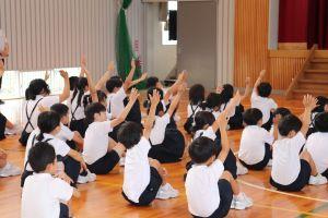 その後、1学期のめあての「自分から」「あきらめない」「伝え合う」について挙手でふり返りを行いました。「自分から」「あきらめない」には、たくさん手が挙がりましたが、、、。