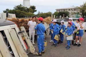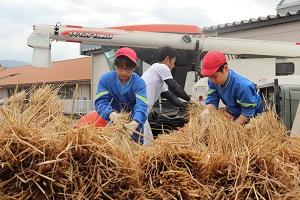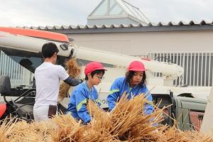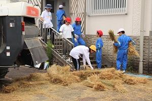 どのように脱穀するか説明を聞いた後、交代でコンバインに運びます。