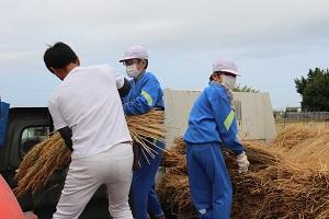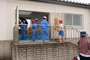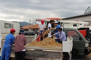 脱穀後のわらは、左義長に使うので、プールの屋根のある場所で保管します。