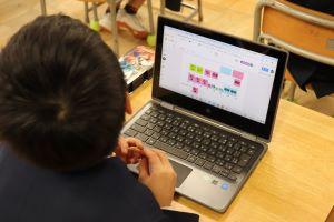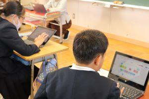 5年生は、国語の学習です。川北町のいろいろなデータをもとに、考えています。