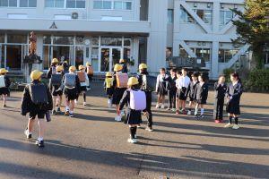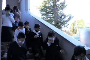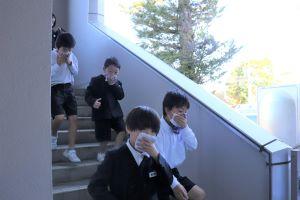 休み時間なので、子どもたちは、出火場所、避難経路を放送で聞き、自分で判断して行動しなければなりません。
