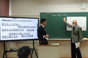 6年生は、道徳「校歌にこめた思い」で、中島小学校元校長の森元先生より、校歌について話してもらいました。