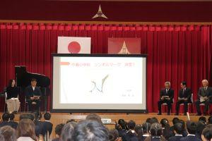 150周年を記念して、三反田の北田さんにシンボルマークを作成していただいたので、全校に紹介しました。