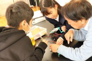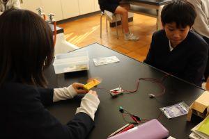 6年生の理科では、手回し発電機を回し、コンデンサーに電気をため、器具を動かしていました。