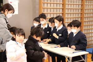 新1年生は、回ってきた場所にシールをはったカードを見ています。
