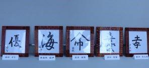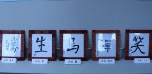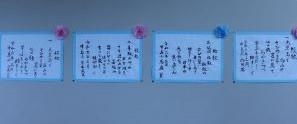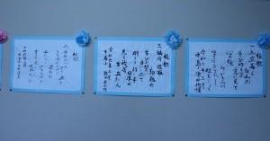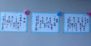 伝統の毛筆での校歌と卒業製作が職員室前廊下に展示されました。