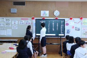 今日のわかあゆタイムに、5年生が国語で取り組んだことを4年生に伝えました。