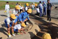 3小学校の5年生が集まり、水害から集落を守る堤防の役割を理解し、実際にミニ水路の護岸について考えました。