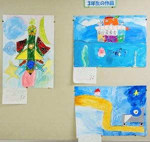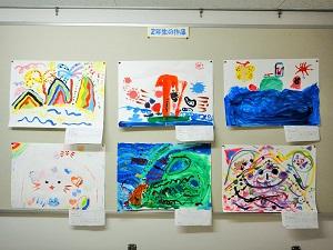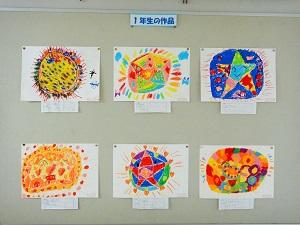 1年生は「おひさま にこにこ」 思い思いの太陽が、元気いっぱいパスで描かれています。