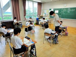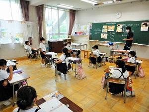 感染症対策のため、換気をし、児童の間隔を大きく空けて並びます。