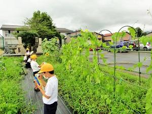 種から芽を出し、大きく育ったホウセンカやヘチマ、ひまわりに花が咲きました。