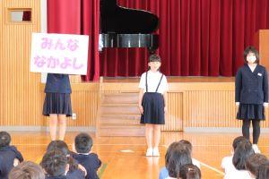 その後、各委員長が活動内容と目当てを伝えました。今年の児童会のめあては、「みんななかよし」、今日は、最初の活動、縦割りチームの発足です。
