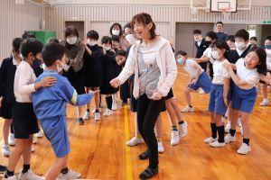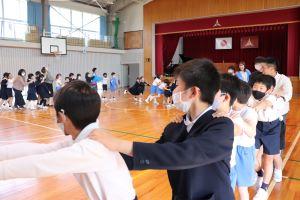 いよいよ全校での「じゃんけん列車」です。運営委員が説明し、岸本先生のピアノに合わせて始まりました。