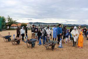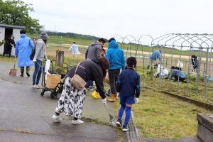毎年のように、天気を心配しながらのファミリーボランティアですが、今日も朝6時頃の天気は小雨で心配しました。しかし、親子で100名近くの方が集まってくださりました。先週までに、草刈りボランティアの方が少しずつ刈ってくださり、今日は、6時頃から機械での草刈りも始めてくださる等、本当に嬉しいかぎりです。