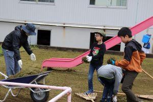 5.6年生は、刈った草を集めて運び、下級生は、一生懸命草むしりをしていました。