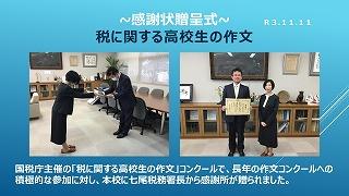 国税庁主催「税に関する高校生の作文」コンクールで、11H笹弥真帆さんが七尾税務署長賞、14H中島あいりさんが金沢国税局長賞を受賞し、七尾税務署長から賞状が手渡されました。また、長年のコンクールへの積極的な参加に対し、本校に金沢国税局長から感謝状が贈られました。