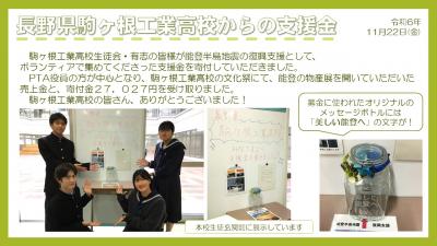 発災直後から本校は物心両面にわたって多大なるご支援を賜りました。たくさんの出会いや出来事、教育活動に必要な物資や経費の援助等を通して、生徒たちは人の温かさを知り、元気をいただきました。