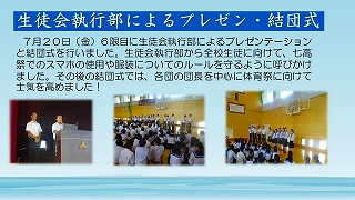 7月20日(金)6限目に生徒会執行部によるプレゼンテーションと結団式を行いました。生徒会執行部から全校生徒に向けて、七高祭でのスマホの使用や服装についてのルールを守るように呼びかけました。その後の結団式では、各団の団長を中心に体育祭に向けて士気を高めました!