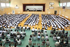 4月9日(月)本校第一体育館にて入学式が行われました。240名の新入生に対して、学校長からは「可能性に挑戦すること」「学ぶことについて考えること」「自ら律すること」と3つのことが伝えられました。