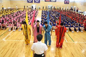 陸上、卓球女子、ソフトテニス部男女、ボート部男女、空手道部女子、放送局が登壇し、優勝旗、賞状を校長先生に渡し、披露して頂きました。