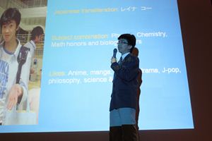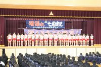 本校は、放送局が制作した学校紹介DVDの他、文系フロンティアコース、理数科の生徒が各コース、科を紹介しました。空手の型やダンス部のダンスも披露されました。
