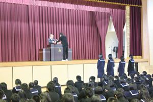 12月22日(木)全校集会と表彰伝達式が行われました。写真はソフトテニス部の表彰伝達式の様子です。