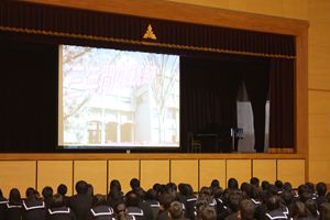 2月10日(金)に送別の会が行われました。 合唱部による合唱や放送局の演奏の他、生徒会によるスライドショーが流されました。3年生の入学当初の写真や、昨年離任された先生からのサプライズメッセージなどが流されました。