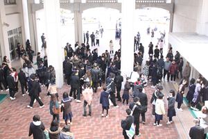 3月14日、平成24年度入学試験における合格発表が行われました。正午12時の発表を前に多くの中学生が玄関前に並びました。番号が掲示されると、喜びの声があがり、携帯で番号を撮影する姿が見られました。240名が合格となりました。おめでとうございます。