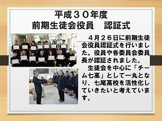 その後、後期生徒会役員の紹介が行われ、生徒会長が代表して抱負を語ってくれました。役員全員はもちろん、全校生徒と協力して七尾高校の生徒会活動を盛り上げていきましょう。