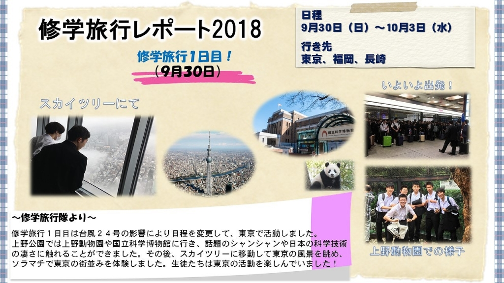修学旅行日目は台風24号の影響により日程を変更して、東京で活動しました。野公園では上野動物園や国立科学博物館に行き、話題のシャンシャンや日本の科学技術の凄さに触れることができました。その後、スカイツリーに移動して東京の風景を眺め、ソラマチで東京の街並みを体験しました。生徒たちは東京の活動を楽しんでいました!