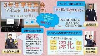 11月日(金)5限目に学年集会を行いました。内容は今後の学習の取り組み方についてでした。これからは、今自分自身に何が必要で何をすべきなのか自分で考えて学習に取り組む自主的な学習へシフトしていきます。自ら考え、行動し、責任の取れる人間を目指して過ごしていきます
