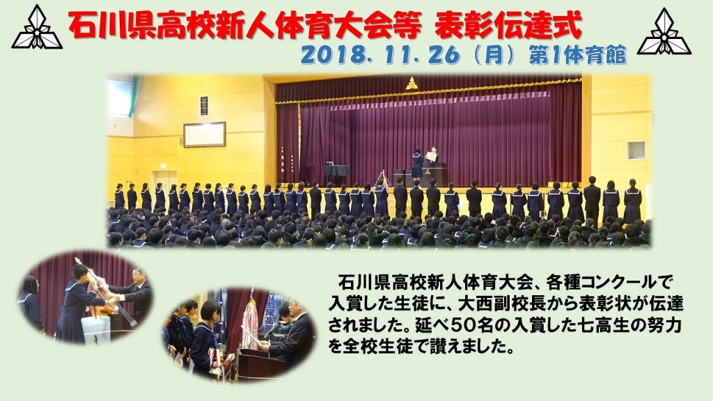 県総体・総文などで入賞した生徒に、大島学校長から表彰状が伝達されました。入賞した七高生の努力と成果を全校生徒で讃えました!