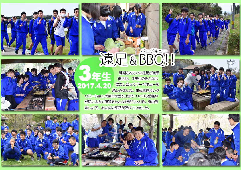 延期されていた遠足が無事催され、3年生のみんなは協力し合ってバーベキューを楽しみました。生徒主体のレクリエーション大会は大盛り上がり!いつも勉強や部活に全力で頑張るみんなが憩うひと時。春の日差しの下、みんなの笑顔が弾けていました。