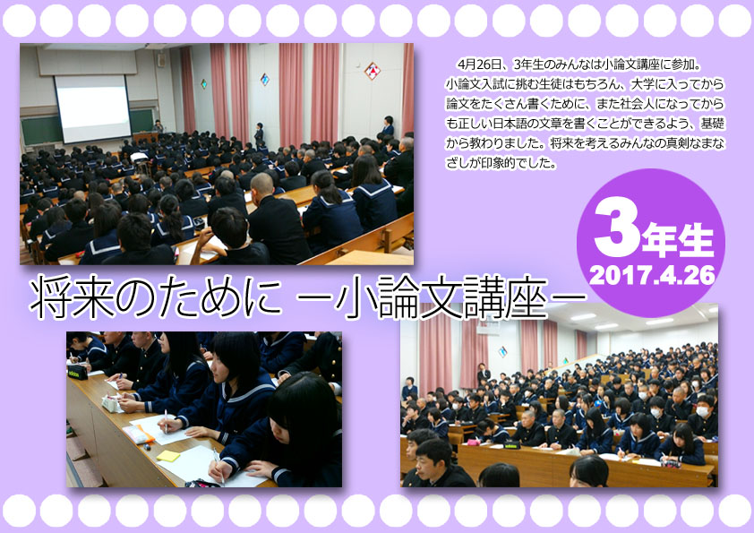小論文入試に挑む生徒はもちろん、大学に入ってから論文をたくさん書くために、また社会人になってからも正しい日本語の文章を書くことができるよう、基礎から教わりました。将来を考えるみんなの真剣なまなざしが印象的でした。