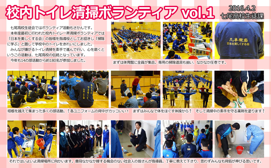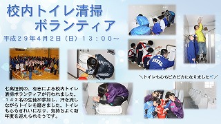 4月2日(日)に七高恒例の、有志による校内トイレ清掃ボランティアが行われました。142名の生徒が参加し、汗を流しながらトイレを磨きました。