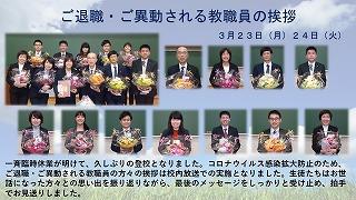 一斉臨時休業が明けて、久しぶりの登校となりました。コロナウイルス感染拡大防止のため、ご退職・ご異動される教職員の方々の挨拶は校内放送での実施となりました。生徒たちはお世話になった方々との思い出を振り返りながら、最後のメッセージをしっかりと受け止め、拍手でお見送りしました。