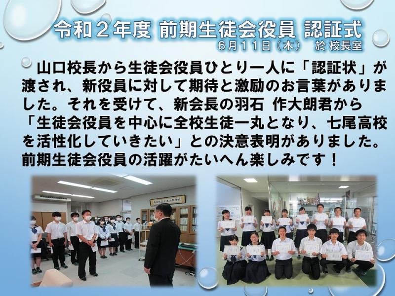 山口校長から生徒会役員ひとり一人に「認証状」が渡され、新役員に対して期待と激励のお言葉がありました。それを受けて、新会長の羽石 作大朗君から「生徒会役員を中心に全校生徒一丸となり、七尾高校を活性化していきたい」との決意表明がありました。前期生徒会役員の活躍がたいへん楽しみです!
