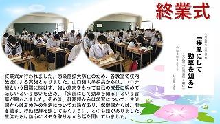 終業式が行われました。感染症拡大防止のため、各教室で校内放送による実施となりました。山口和人学校長からは、コロナ禍という困難に挫けず、強い意志をもって自己の成長に努めてほしいという思いを込め、「疾風にして勁草を知る」という言葉が贈られました。その後、教務課からは学習について、生徒課からは夏休みの生活についてお話があり、保健課からは、引き続き、行動記録を残しておくように、とのお話がありました。生徒たちは熱心にメモを取りながら話を聞いていました。