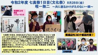 七高祭1日目は、校長先生から「Make Miracle, Make Drama in 七高 with コロナ」をモットーに七高祭を行おうとのお話があり、生徒会長からは七高祭を開催できることへの感謝の気持ちをもち、万全なコロナ対策を行っていこうという開会のあいさつがありました。その後、生徒会制作のオープニングムービー、Miss&Mr.候補紹介の動画に始まり、模擬店や芸コン、カラオケ&バンドなどの企画、吹奏楽局・合唱部・書道部の発表が行われました。