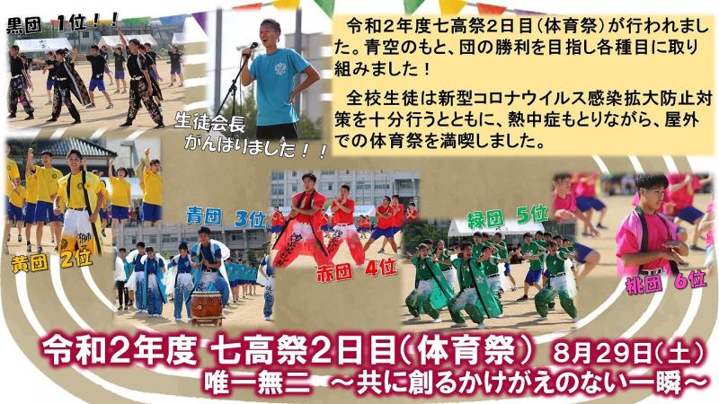 令和2年度七高祭2日目(体育祭)が行われました。青空のもと、団の勝利を目指し各種目に取り組みました!