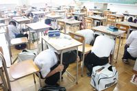 本日、県民一斉防災訓練が行われました。生徒たちは報告音を聞くと、机の下に入り、安全行動をとっていました。