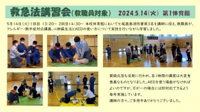5月14日(火)1回目 13:20~ 2回目14:30~ 本校体育館において七尾鹿島消防署員3名を講師に迎え、教職員が、アレルギー・熱中症対応講義、心肺蘇生法とAEDの使い方について実技を行いながら学習しました。