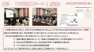 2学期が始まるにあたり,2学年では学年集会を行いました。よく「中だるみ」と言われる2年生ですが,1学期と夏休みの行動を振り返り,自分自身を「より良く」変えていくためにはどうすればよいか考えました。